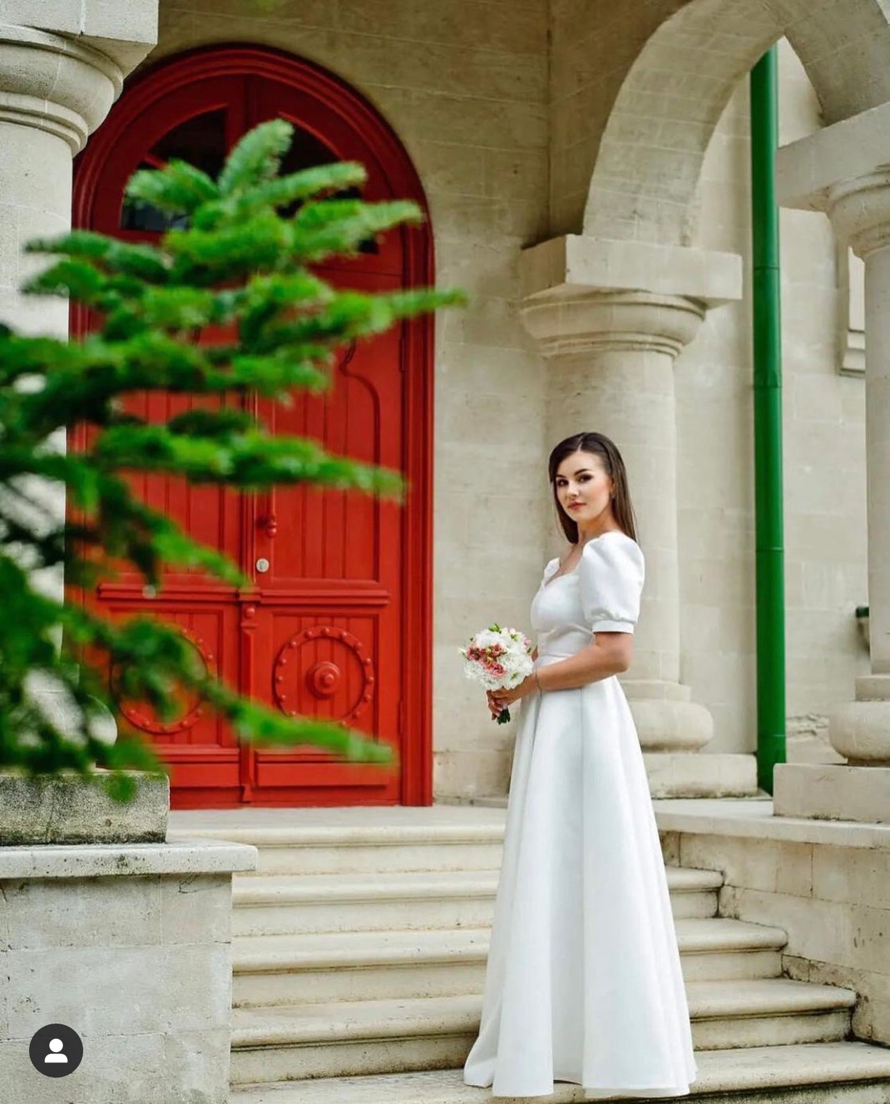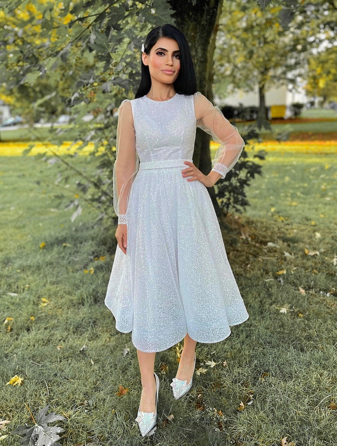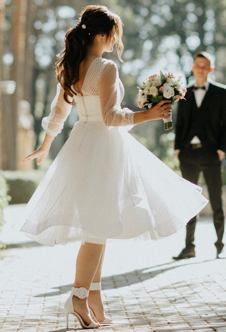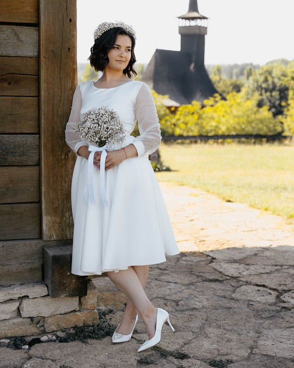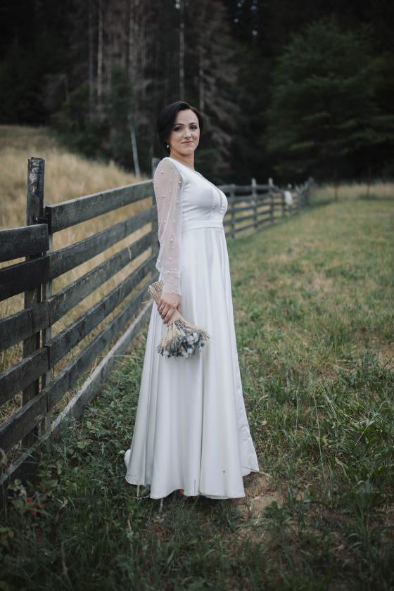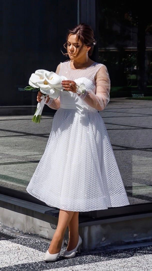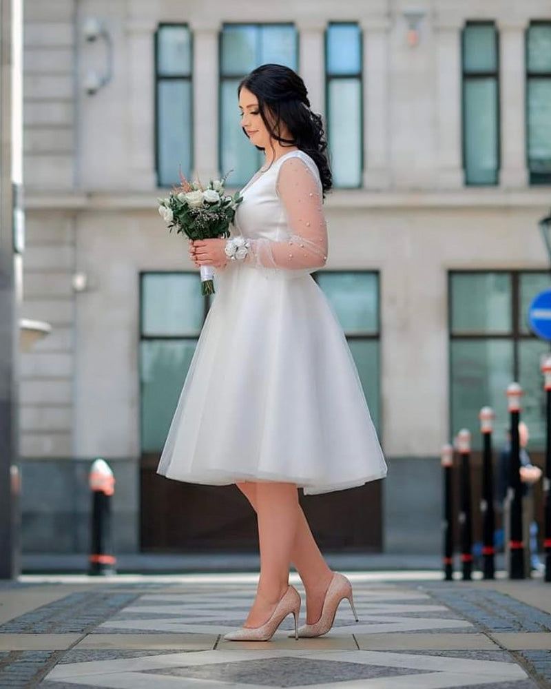 Abito per matrimonio civile particolare, svasato, con maniche lunghe e scollo