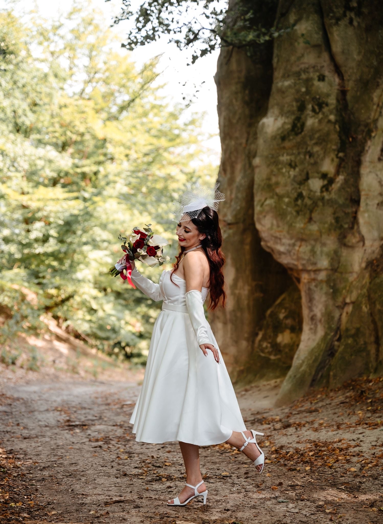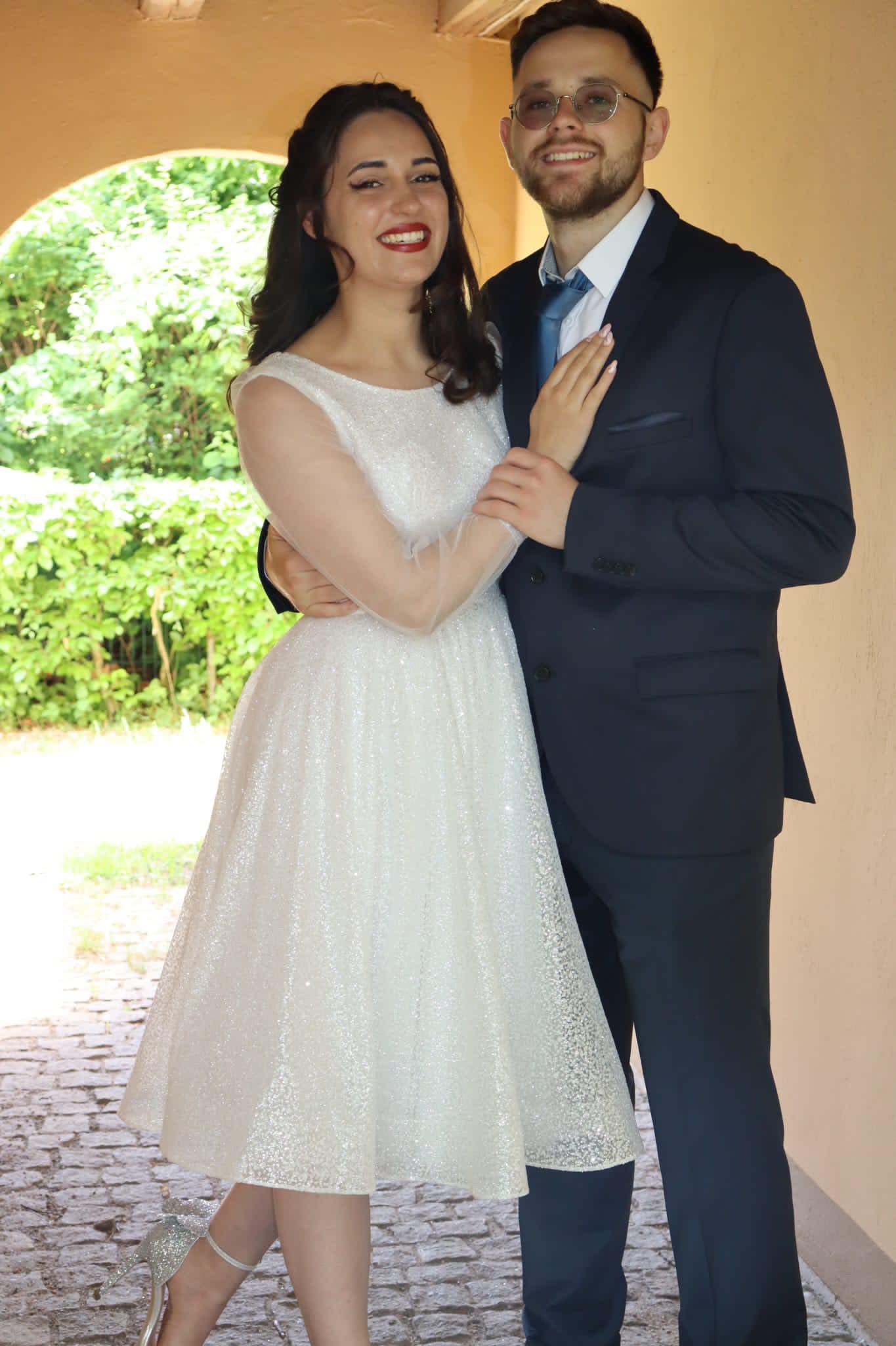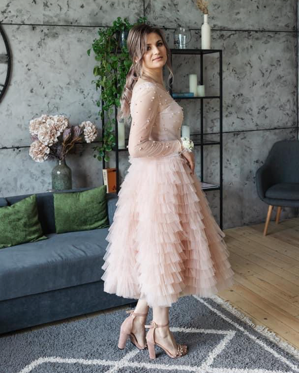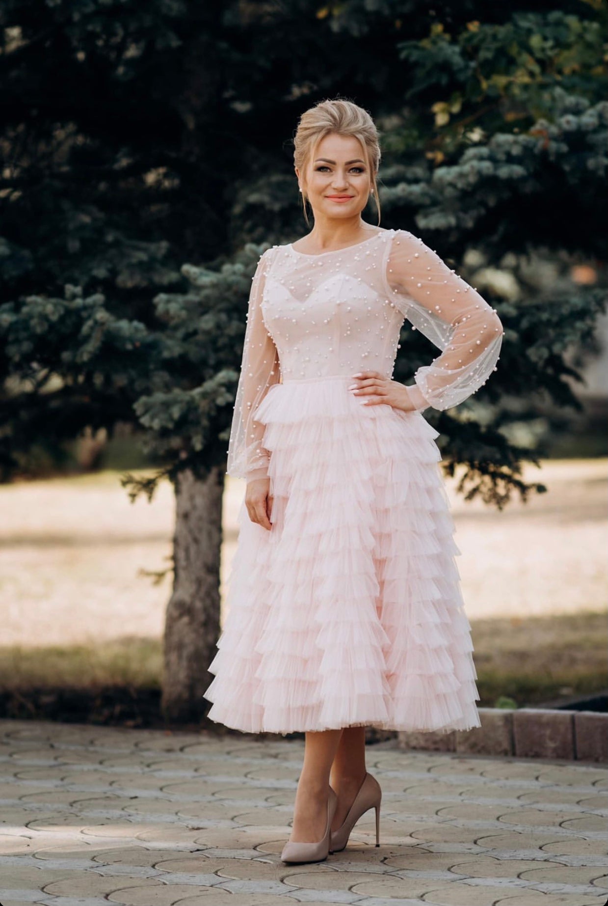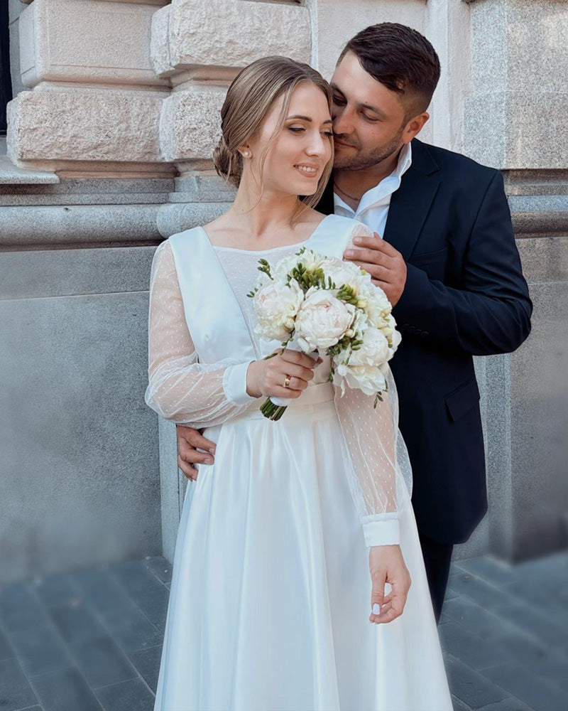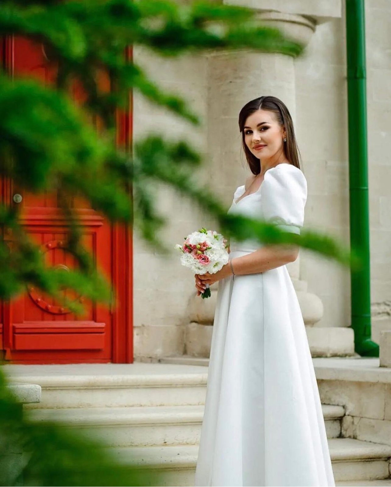 Abito per matrimonio civile particolare, svasato, con maniche lunghe e scollo