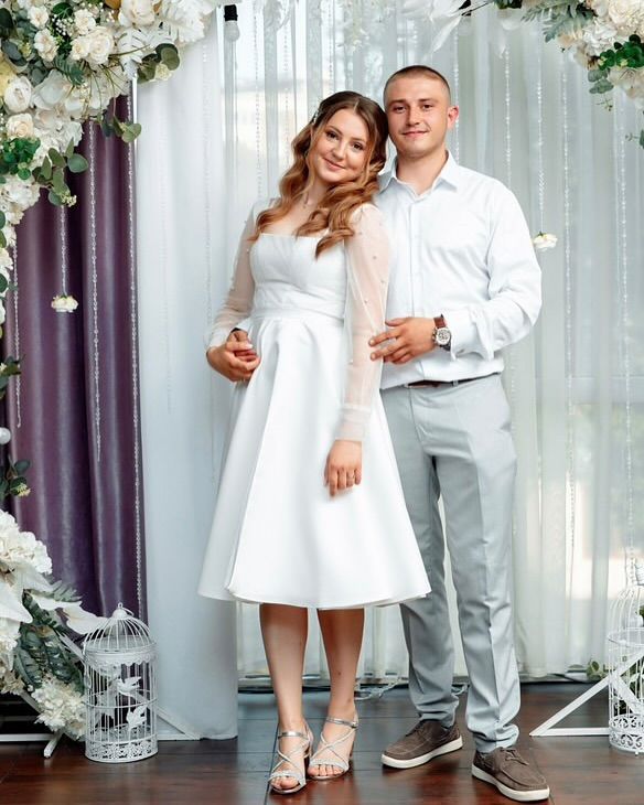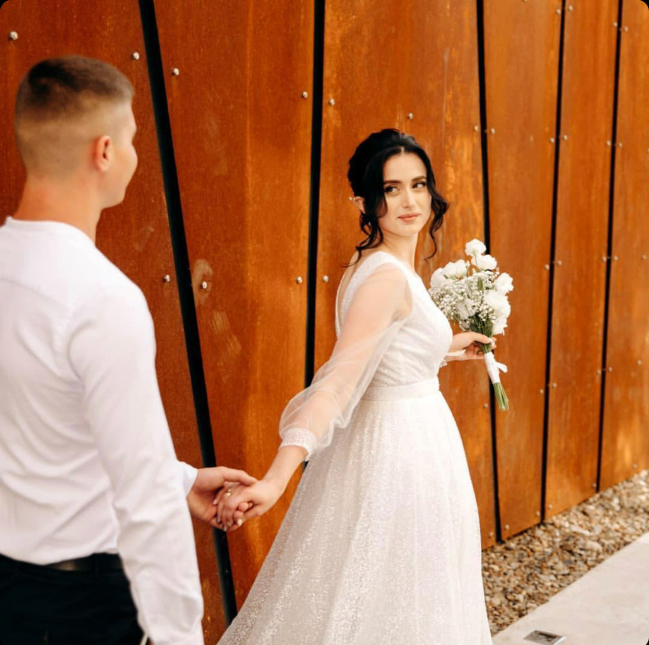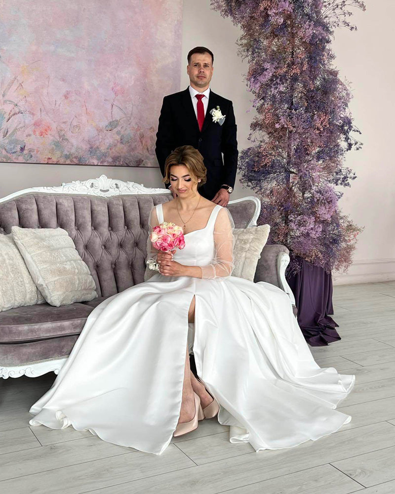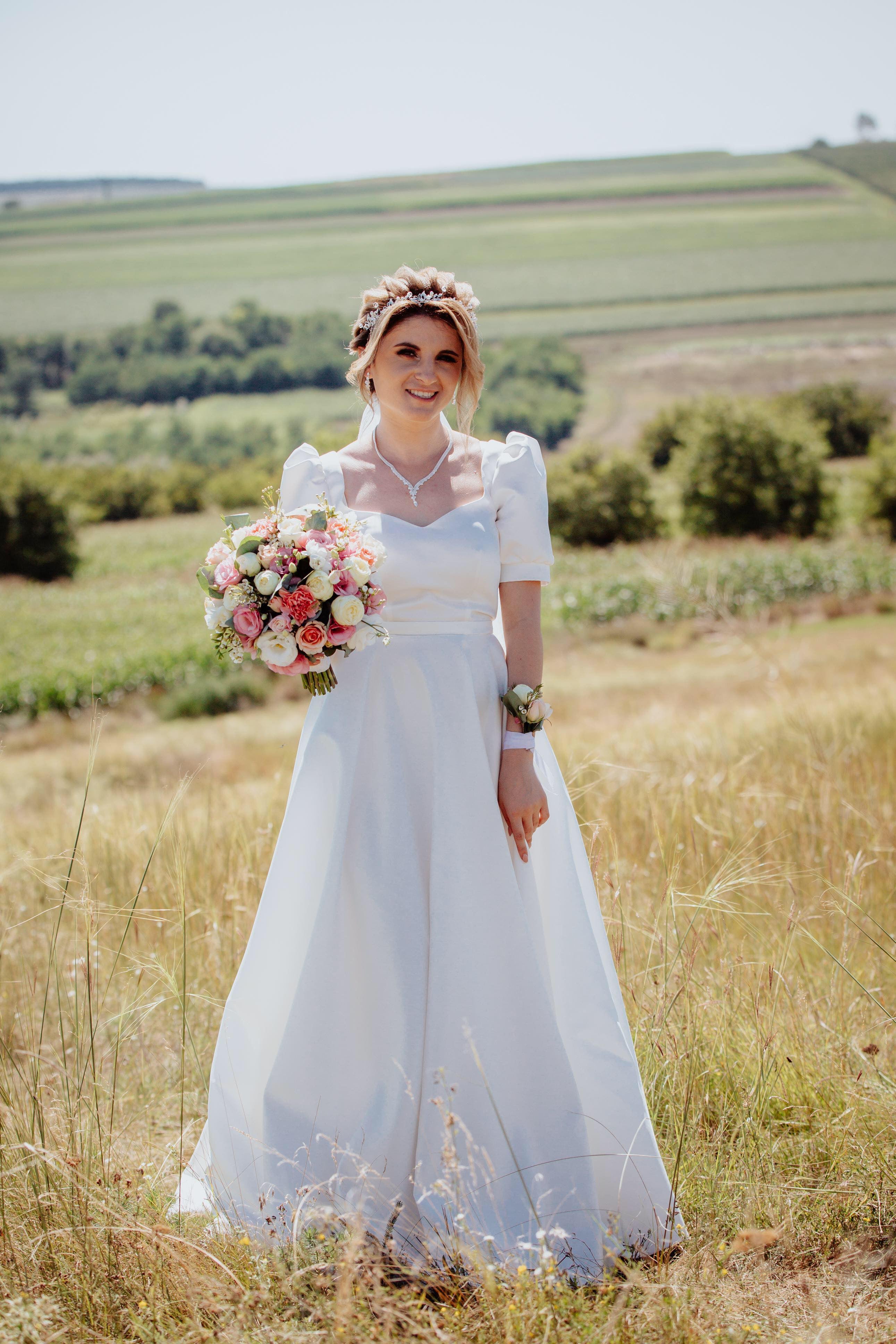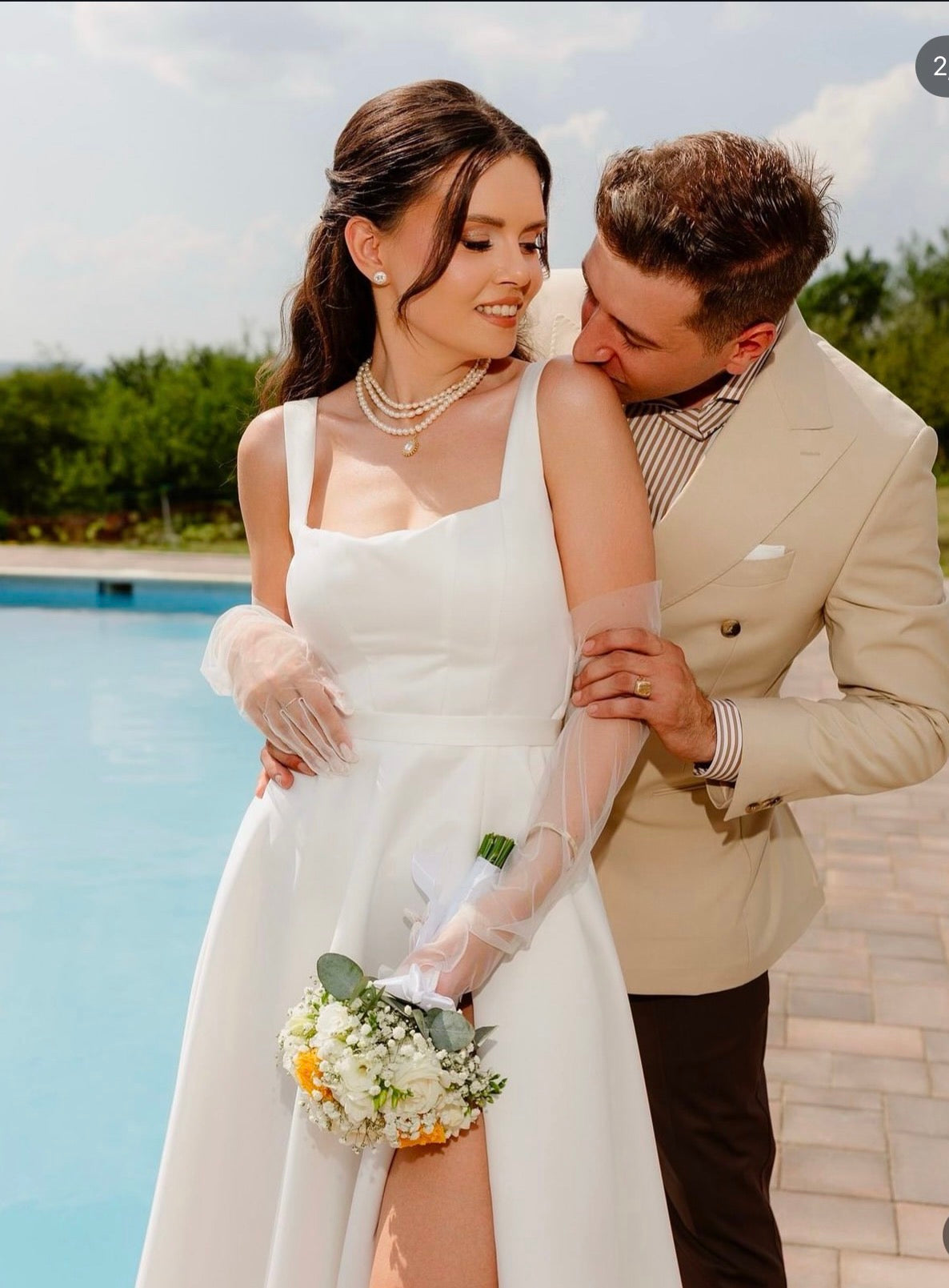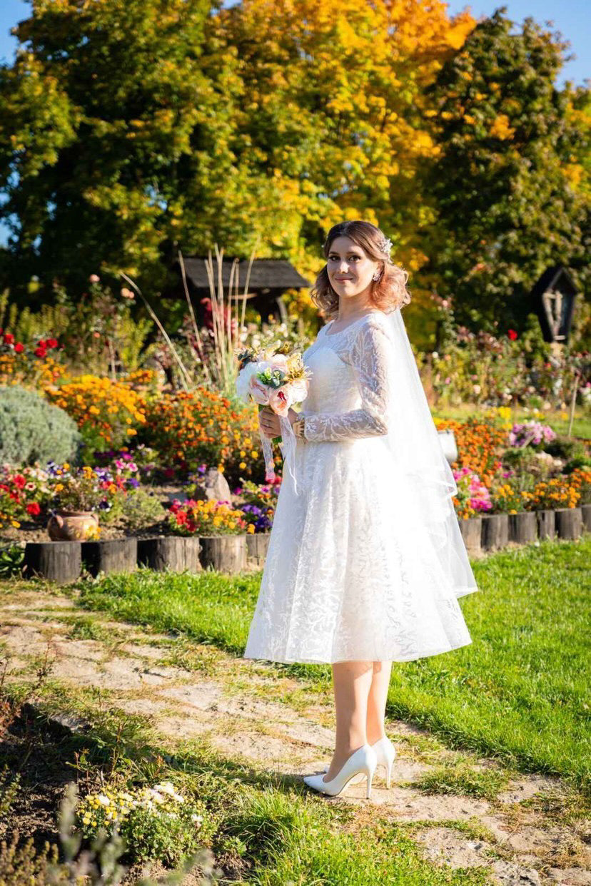 Abito per matrimonio civile particolare, svasato, con maniche lunghe e scollo