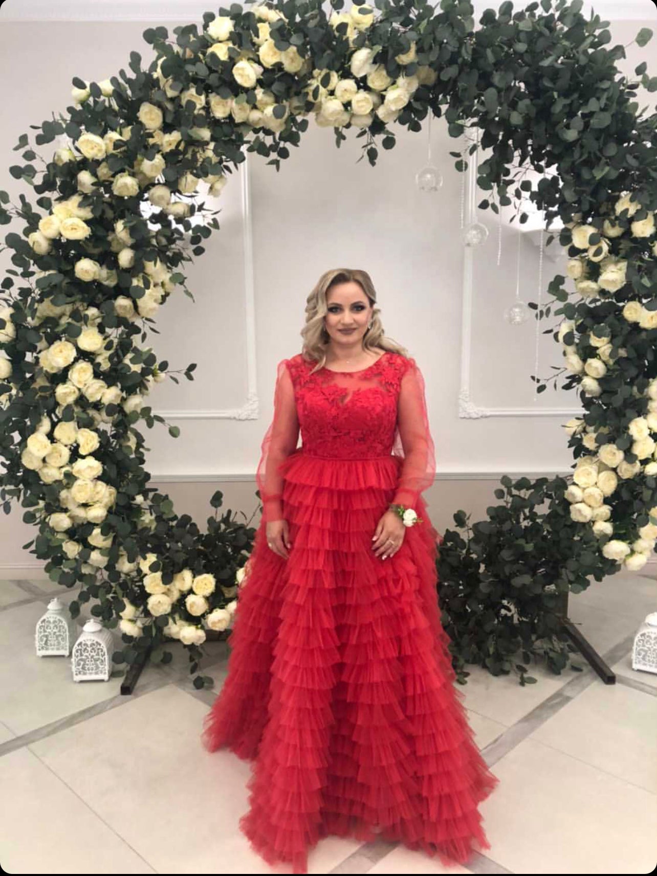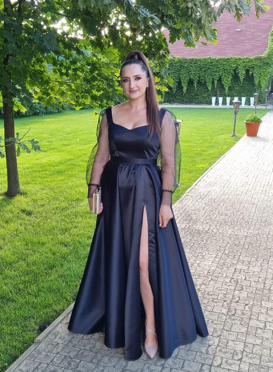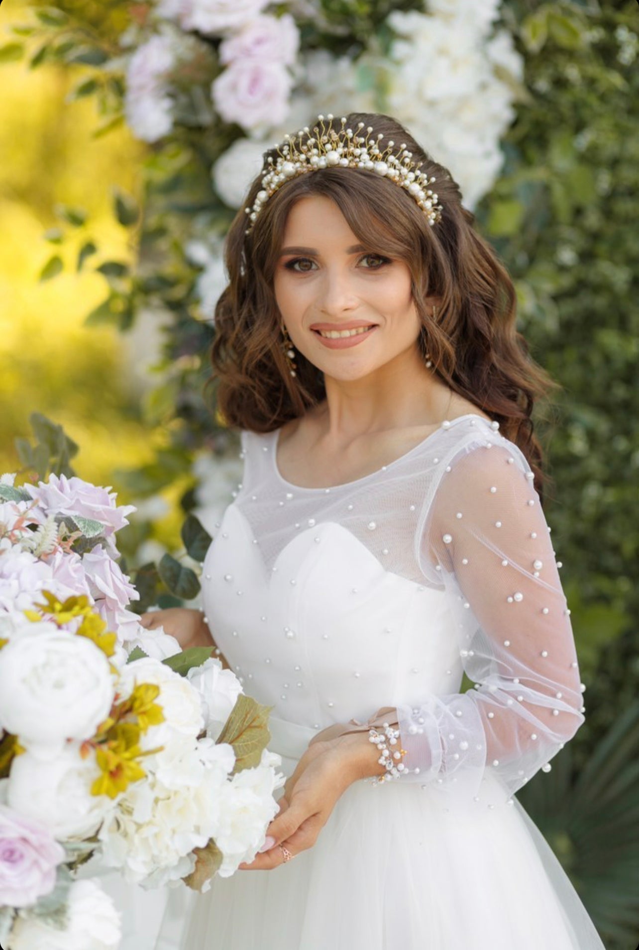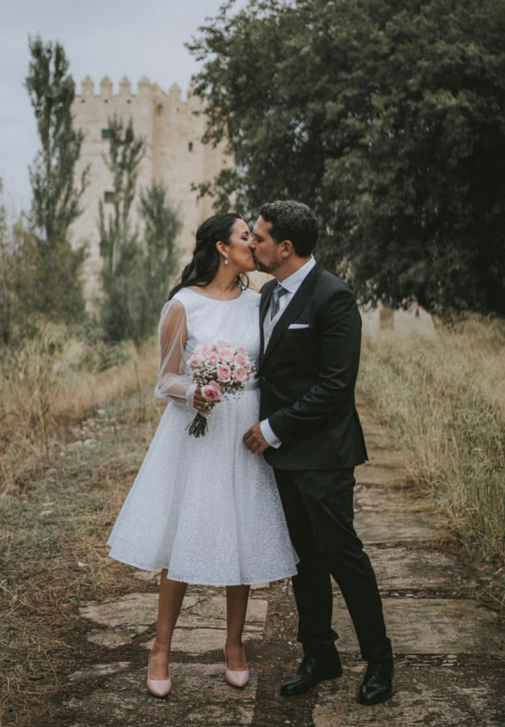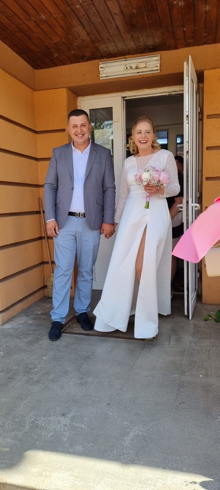 Abito per matrimonio civile particolare, svasato, con maniche lunghe e scollo