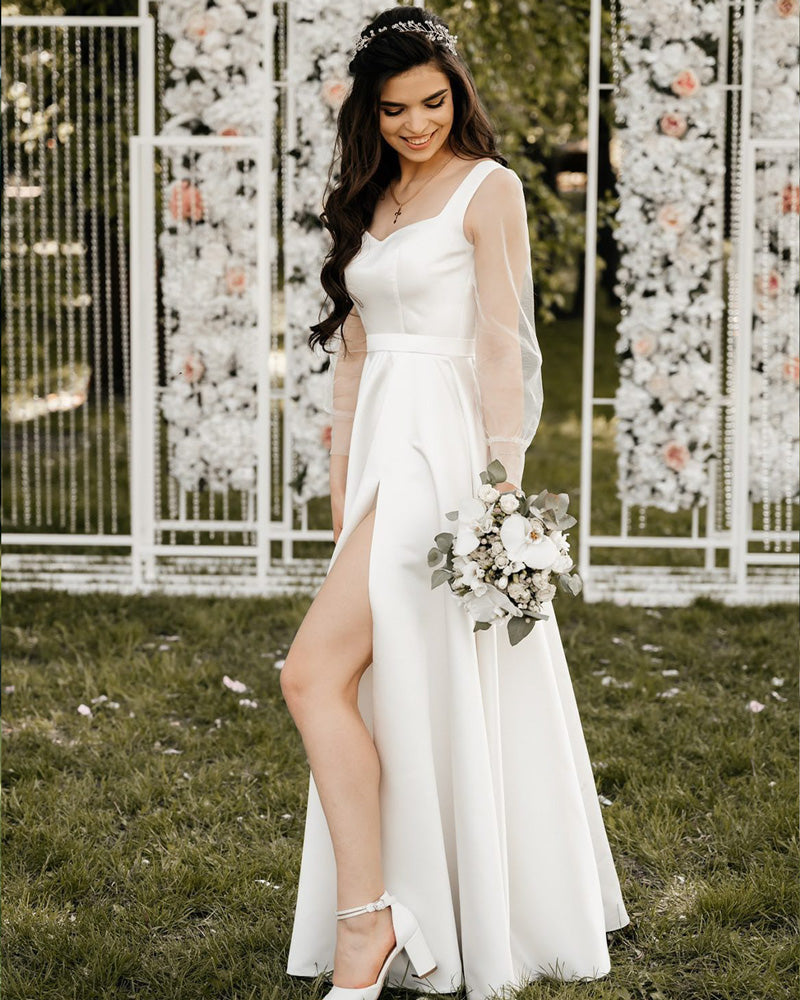 Abito da sposa bianco lungo, con spacco elegante e raffinato in raso